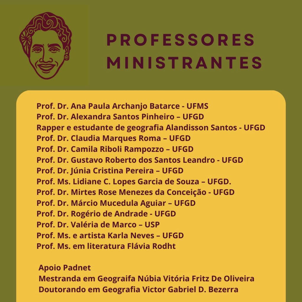 As atividades estão sendo conduzidas por docentes da UFGD vinculados ou convidados do projeto de extensão “Territórios de Escrevivências”, que utiliza o conceito de escrevivência para refletir sobre desigualdades sociais e étnico-raciais. O projeto é desenvolvido por professores de diferentes áreas, como Geografia e Letras, e estabelece diálogos com escolas e grupos de estudo, ampliando a articulação entre universidade e comunidade.